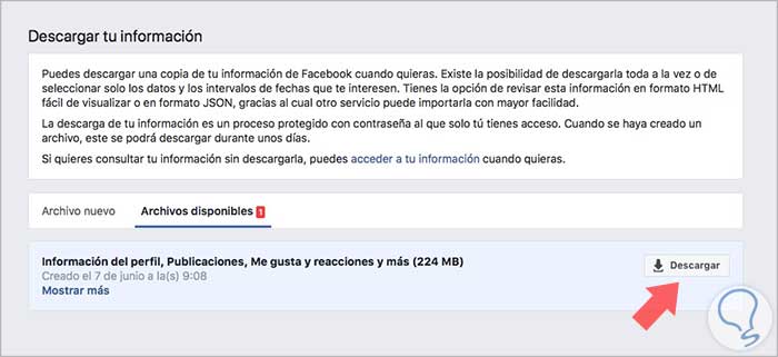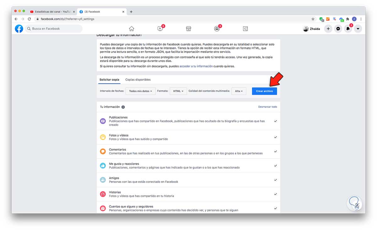 El siguiente paso será una nueva ventana en la que vamos a tener la posibilidad de crear un archivo con toda la información acerca de nuestras publicaciones, videos, mensajes, conversaciones , información… que hayamos compartido en Facebook. Tenemos que señalar “Crear archivo” una vez que hayamos marcado con un check toda la información que queremos descargar.