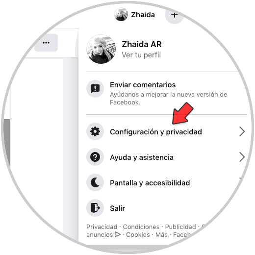Lo primero de todo es entrar en tu cuenta de Facebook con tu contraseña y usuario. Una vez que estamos dentro, tenemos que dirigirnos dentro del menú situado en la parte superior derecha, y pulsar sobre "Configuración y privacidad"
