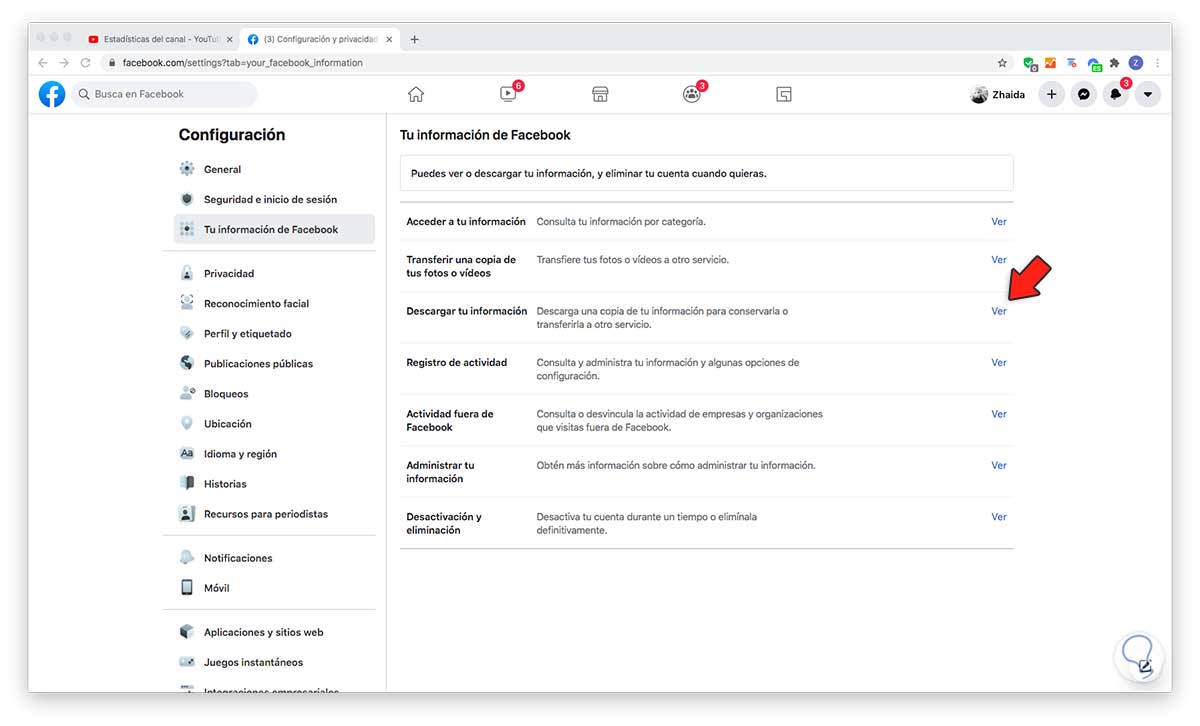 Ahora que estamos dentro de la configuración, tenemos que situarnos en la pestaña de "Tu información de Facebook". Una vez aquí, veremos que tenemos la oportunidad de acceder a toda nuestra información almacenada en Facebook, o descargar nuestra información. Debemos seleccionar esta opción.