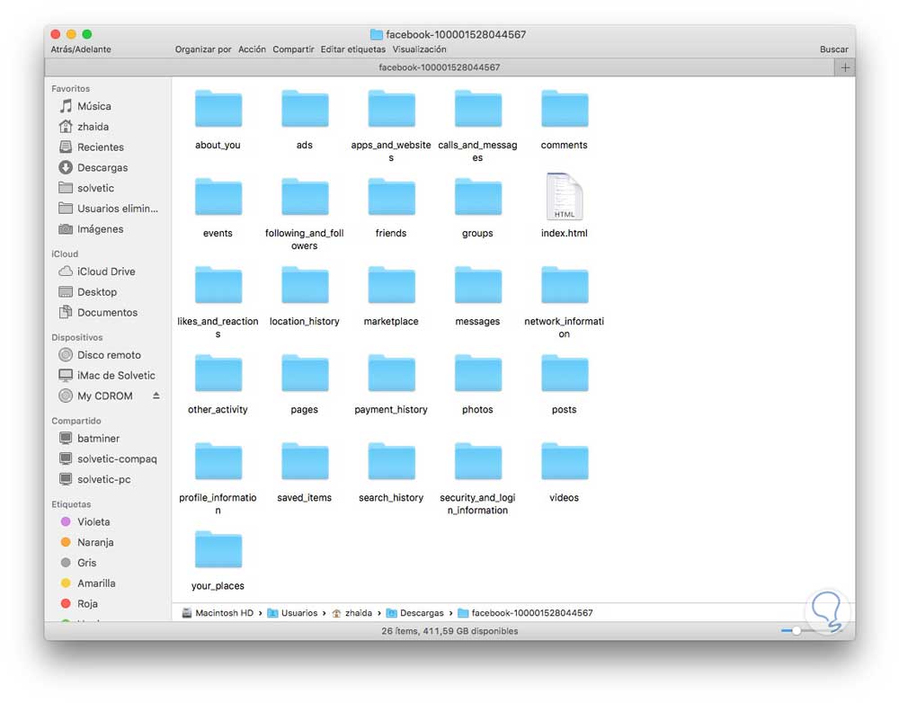 Una vez descargado el archivo, vamos a ver diferentes apartados con toda nuestra información compartida en la red social. Podemos ir accediendo a cada uno de ellos en función de aquello que estamos buscando.