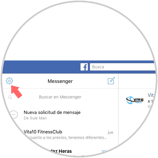 Lo primero que debes hacer es entrar en Facebook Messenger. Una vez aquí, entrar en la conversación la cual quieres archivar. Ahora debes seleccionar el icono de la rueda dentada situado en la parte superior.