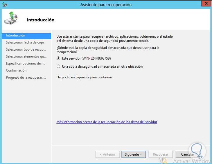 Como vemos tenemos sólo una opción a elegir debido a que no hemos realizado copias de seguridad programadas anteriormente, damos clic en Siguiente.