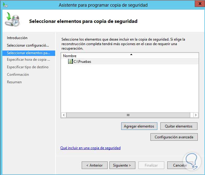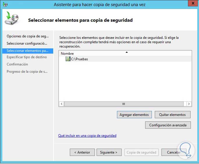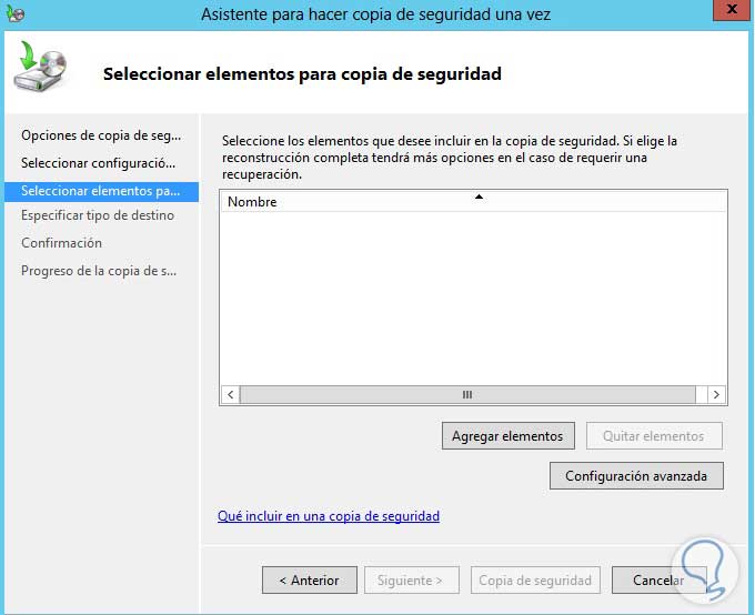 Damos clic en Siguiente, veremos en la siguiente ventana que podemos añadir los archivos a los cuales se les ha de realizar copia de seguridad, para ello damos clic en Agregar elementos y proceder a agregar los que consideremos necesarios: