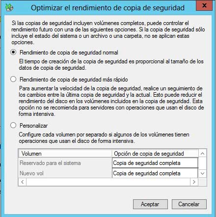 Vemos que por defecto la opción seleccionada es la copia de seguridad normal, si dejamos esta opción, se creará una copia de seguridad completa. Depende de las configuraciones que necesitemos activemos si deseamos normal o rápido teniendo en cuenta las consideraciones que indica el sistema.