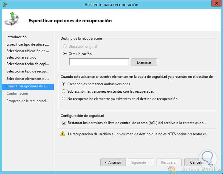 A continuación el asistente nos preguntará por el sitio a donde deseamos recuperar nuestros archivos, podemos elegir la misma ubicación o un destino diferente, marcamos la opción más adecuada, y podemos definir algunos parámetros al momento de recuperar como: