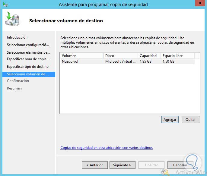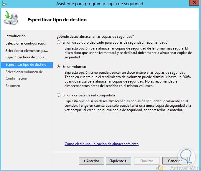 Dependiendo de lo seleccionado, en la siguiente ventana el asistente nos pedirá seleccionar el destino exacto (El volumen, la carpeta compartida o el disco dedicado).