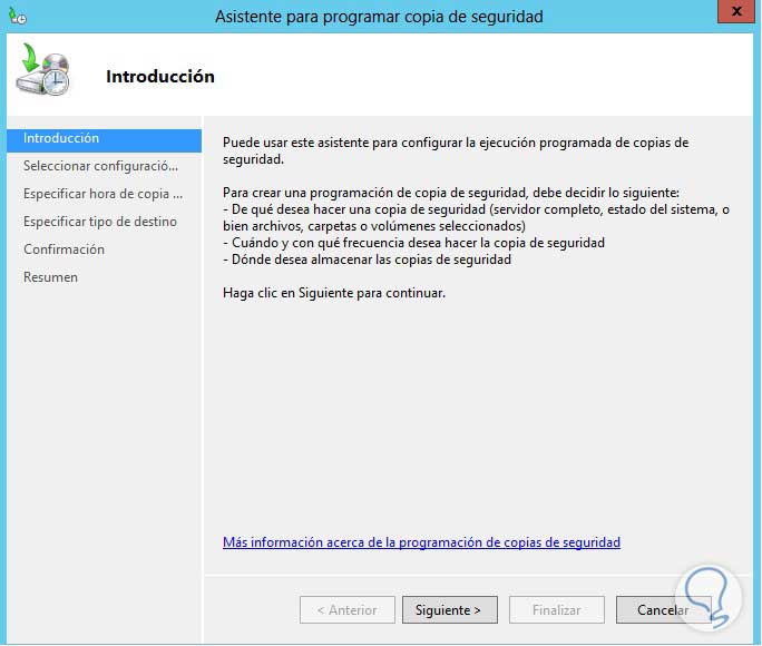 Como ya lo mencionamos anteriormente, podemos programar en una fecha determinada el respaldo de nuestro servidor, para ello abriremos el asistente mediante el comando wbadmin.msc desde la línea de comandos y seleccionamos la opción Programar copia de seguridad.