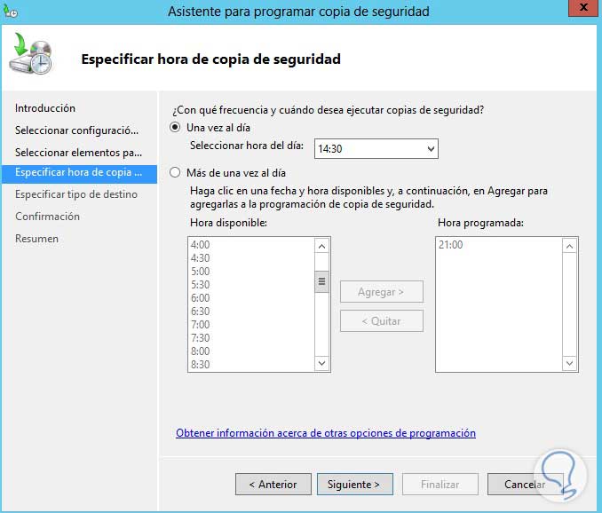 En la siguiente ventana elegiremos el día y la hora que deseamos para realizar la copia de seguridad, podemos elegir si realizar la copia de seguridad una vez al día o elegir varias veces al día, esto depende de la cantidad e importancia de la información registrada durante el día.