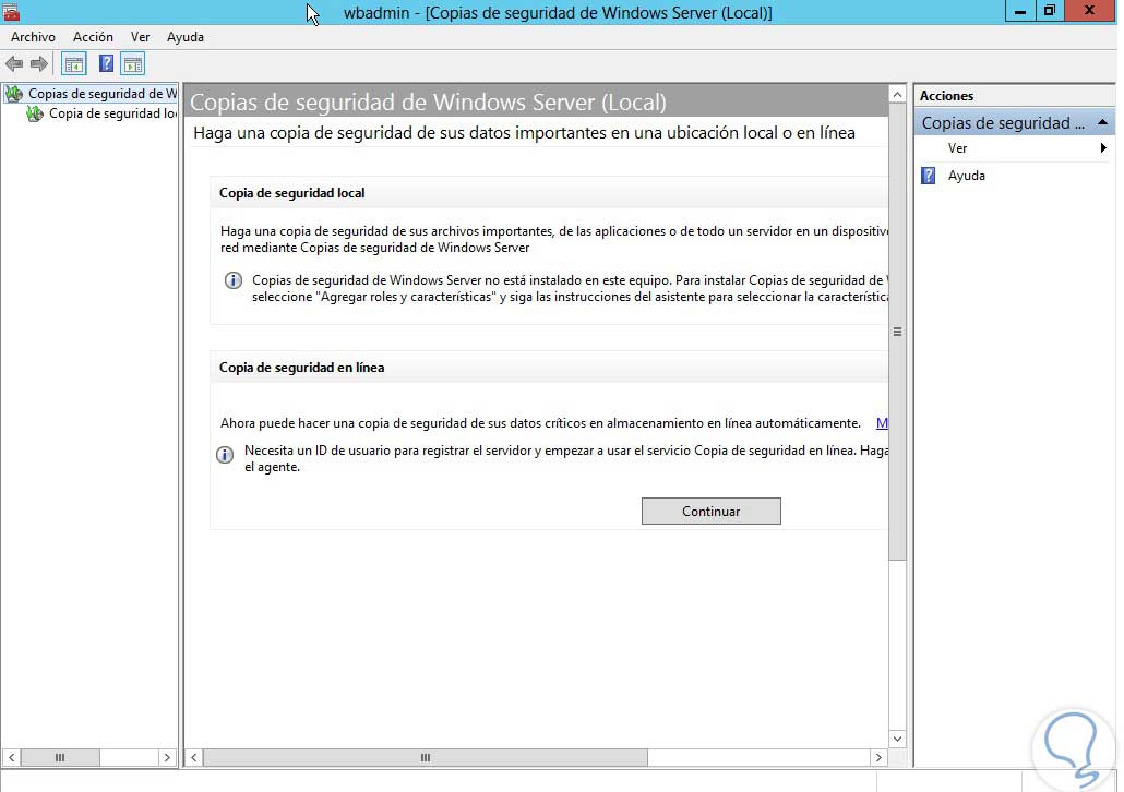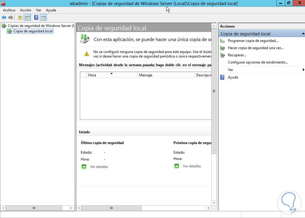 Una vez instalada la característica procedemos a abrir nuestro wbadmin y seleccionamos la opción Copia de seguridad local ubicada en el panel lateral izquierdo:
