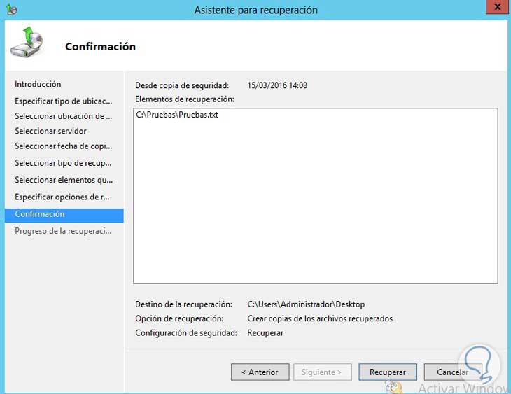 Una vez hayamos dado clic en Siguiente se desplegará una ventana indicándonos el archivo a recuperar, la ubicación donde se va a enviar el archivo recuperado y las opciones que hayamos establecido.