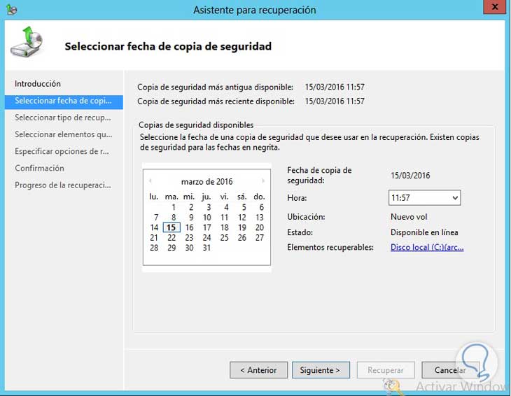 Damos clic en Siguiente y a continuación seleccionamos alguna fecha para usar en la recuperación, el sistema nos muestra la fecha más antigua y la más reciente.