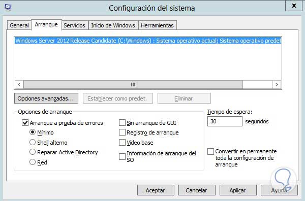 Se desplegará la siguiente ventana donde elegiremos la opción Arranque y allí en la parte inferior izquierda seleccionamos la opción Arranque a prueba de errores y seleccionamos la opción que más nos convenga.