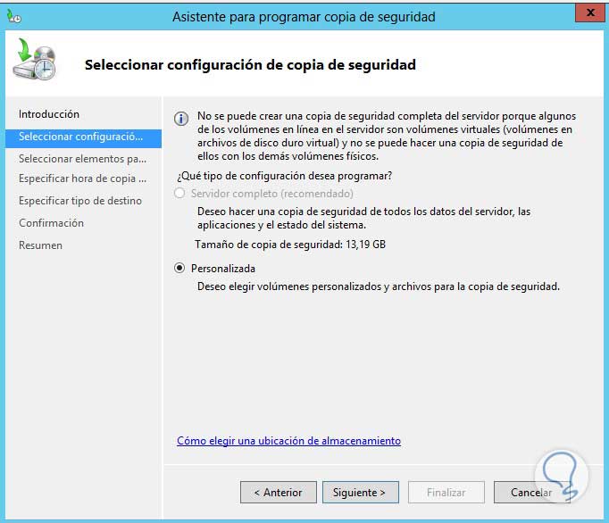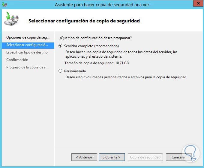 En esta ventana elegimos el tipo de configuración, veremos que podemos elegir si respaldamos el servidor completo o personalizada para respaldar únicamente algunos archivos, en nuestro caso seleccionamos Personalizada y damos clic en Siguiente.