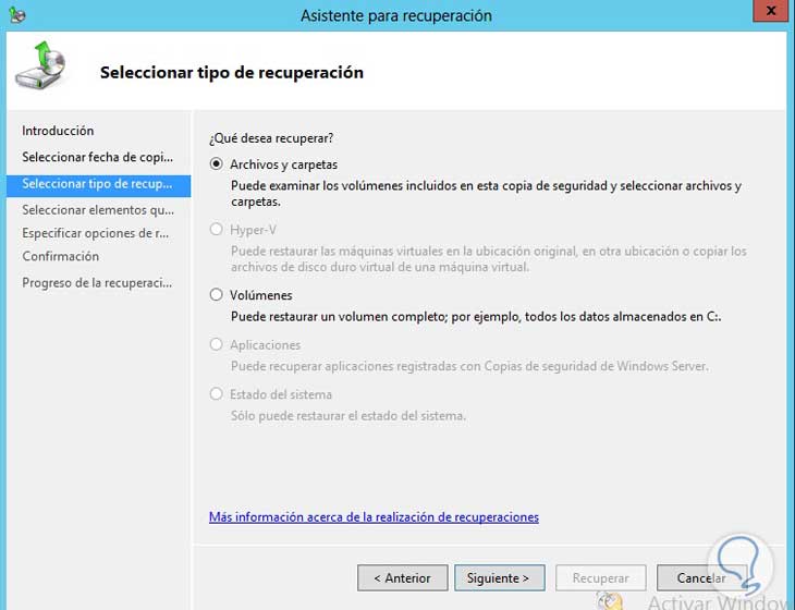 Seleccionamos la fecha y damos clic en Siguiente, a continuación el sistema nos pregunta que deseamos recuperar (en base a la copia que hayamos realizado), tenemos las siguientes opciones: