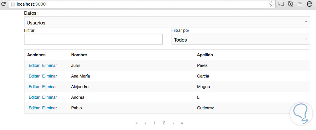 Expliquemos un poco lo que hay en la interfaz. Tenemos un selector llamado datos. Este se encargará por medio de changeData extraer la información que hemos guardado en services.js. El campo filtrar se encarga de ir mostrar la información específica que indiquemos cuando escribimos en dicho campo, y “filtrar por” se encarga de detallar por cual columna queremos filtrar, por defecto filtra por TODOS los campos, también puedes darle click a las columnas para organizarlas descendente y ascendente. Haz de tu parte las distintas pruebas. Los campos editar y eliminar no son funcionales por ahora.