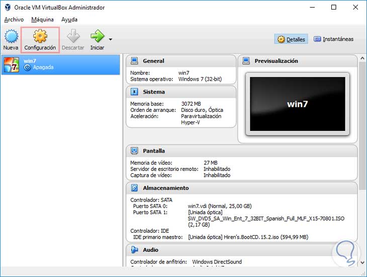 En virtual box, seleccionamos la máquina a la que deseamos agregar la .iso y pinchamos en configuración.