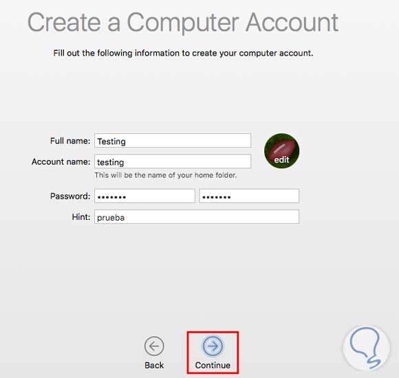 Crearemos una cuenta para el ordenador y damos a Continue.