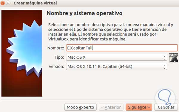Le damos un nombre, elegimos en tipo MAC OS X y en versión elegimos El Capitan.