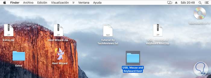 En el menú de nuestra máquina virtual vamos a pinchar en Dispositivos y ahí nos situamos en Unidades ópticas, donde pincharemos en Seleccionar imagen de disco…, buscamos donde tenemos nuestra .iso del bootloader y la agregamos, acto seguido nos aparecerá el icono de un CD en el escritorio del MAC, le abrimos y copiamos el contenido al escritorio, hacemos doble click en cada archivo zip para extraer su contenido, nos debe quedar como se ve en la siguiente imagen.