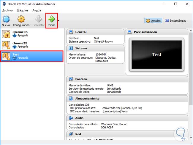 Seleccionamos la máquina virtual recién creada y damos a Iniciar.
