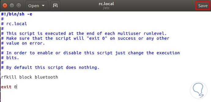 sudo gedit /etc/rc.localEsta sentencia te abrirá el archivo rc.local, en el debemos escribir rfkill block bluetooth antes de la línea de exit 0 y guardas, tal y como puedes ver en la siguiente imagen: