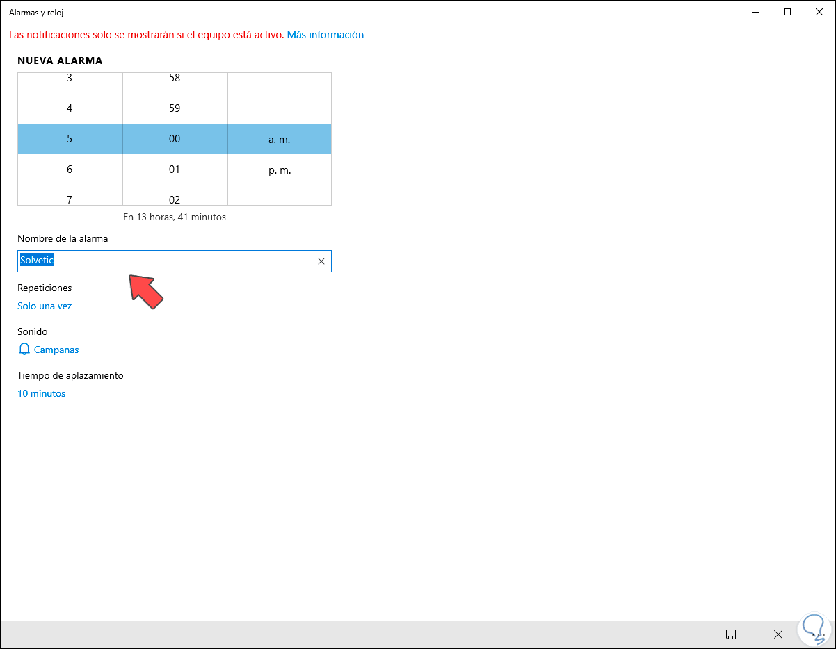 En la ventana de creación de nueva alarma ves que puedes configurar diferentes parámetros.