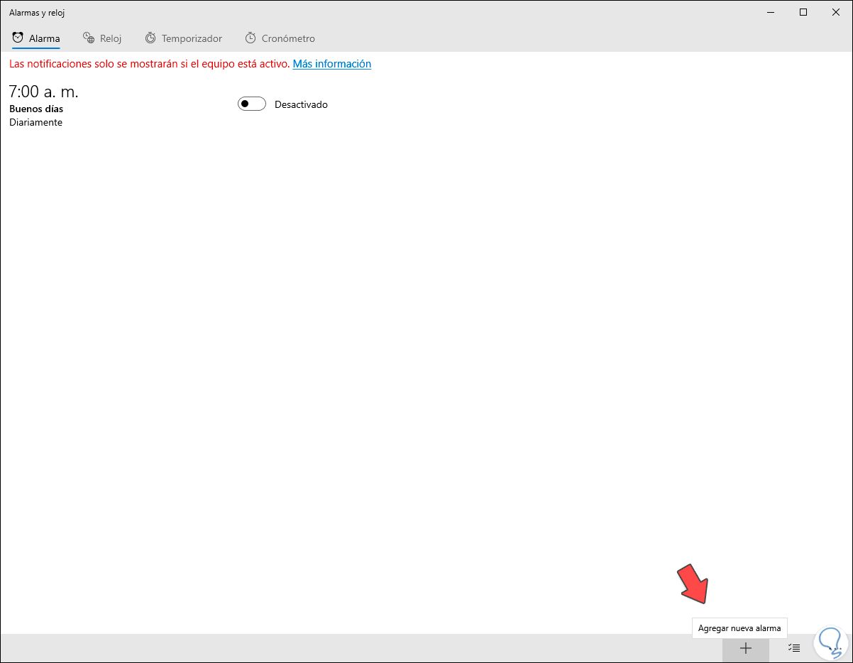 Como verás en la pantalla que te aparece, están las alarmas que vienen por defecto o que quizás ya habías programado en otra ocasión. Para agregar una nueva dirígete al símbolo de + para añadirla.