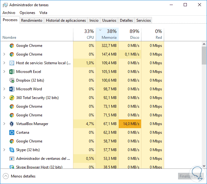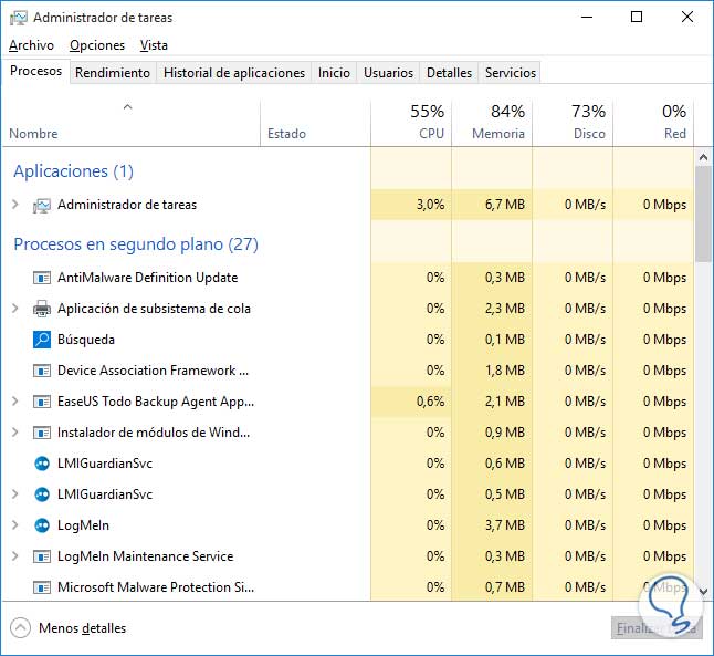 Ahí es donde el administrador de tareas se convierte en un aliado para nosotros, ya que podemos con exactitud y en tiempo real conocer en un determinado proceso que porcentaje de recursos está usando a nivel de memoria, disco y CPU.