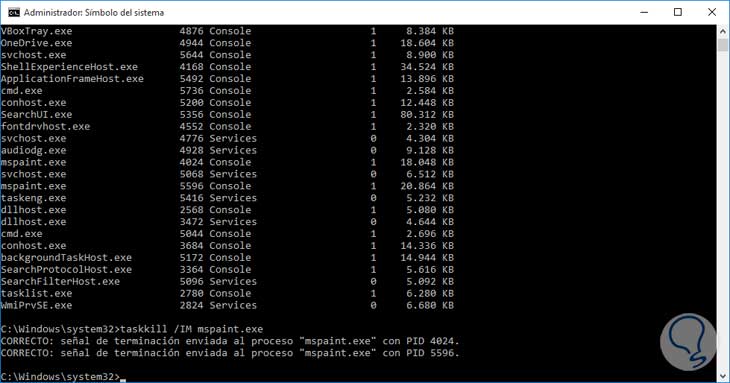 Como vemos usando comando taskkill Windows 10 podremos detener aquellos procesos y servicios que presentan fallos en el sistema. Si usamos de nuevo el comando tasklist veremos que el proceso mspain.exe del programa Paint ya ha sido eliminado.