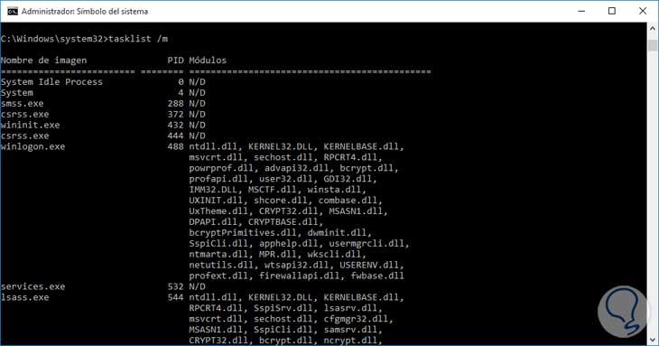Tasklist /mMuestra todos los procesos que usan un módulo exe o dll específico. Por ejemplo si deseamos ver todos los procesos que están corriendo en este momento en la máquina usaremos lo siguiente:
