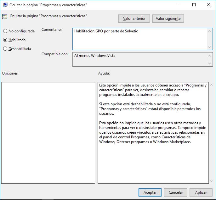 Vamos a editarla para que la opción Agregar o quitar programas desaparezca del Panel de Control en la opción Programas, en este caso debemos habilitar la GPO y si deseamos agregar un comentario.