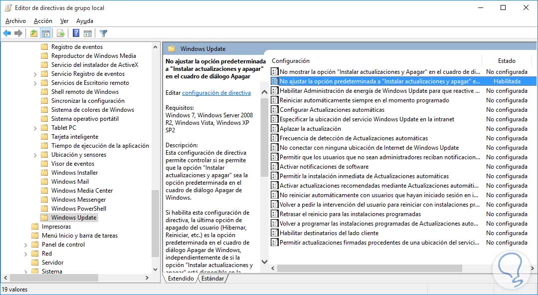 En este estudio vamos a seleccionar la opción no ajustar la opción predeterminada a “Instalar actualizaciones y apagar en el cuadro de diálogo Apagar”. Damos doble clic y se desplegará lo siguiente: