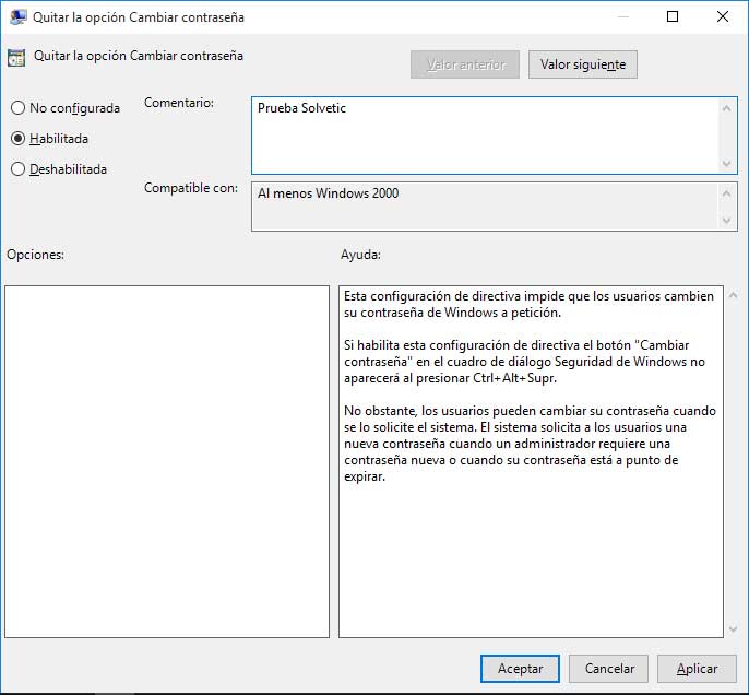 Por lo general, todas las opciones que seleccionemos en el editor de GPOs tendrán la misma estructura: