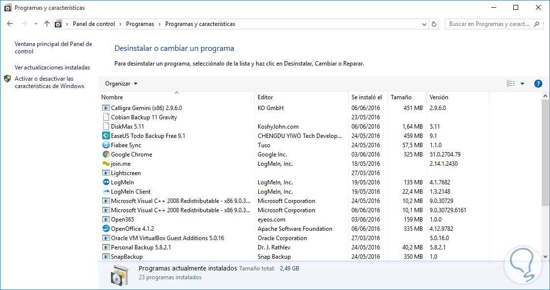 Panel de control / Programas / Programas y características