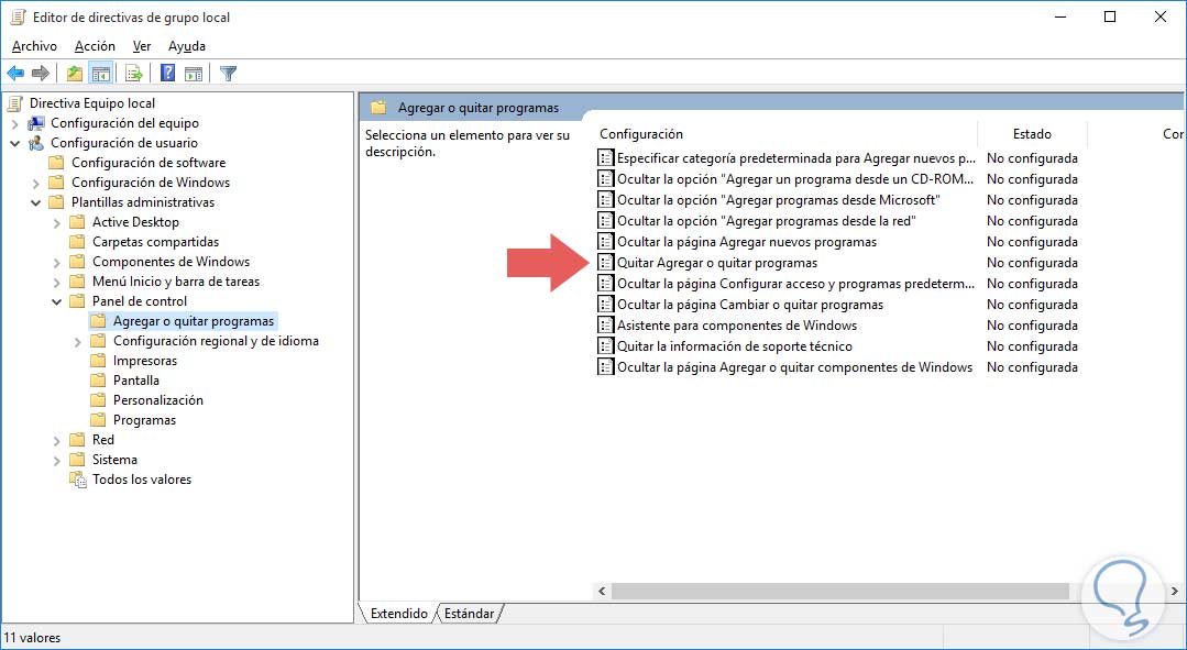 Configuración de usuario / Plantillas administrativas / Panel de control / Agregar o quitar programas