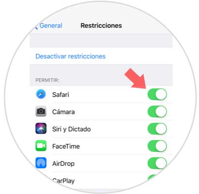 Ahora tenemos que fijarnos que Safari debe estar activado en "On" (verde)
