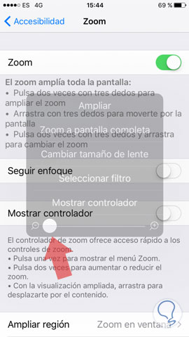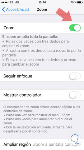 Con estos sencillos pasos ya hemos activado la función de “zoom”. Ahora para poder utilizarla, pulsamos dos veces en la pantalla con tres dedos para entrar en el modo de zoom. Aparecerá el siguiente menú y allí podemos mover el cursor que se encuentra en la parte de abajo, y con él podremos agrandar o hacer más pequeña la letra de toda la pantalla completa.
