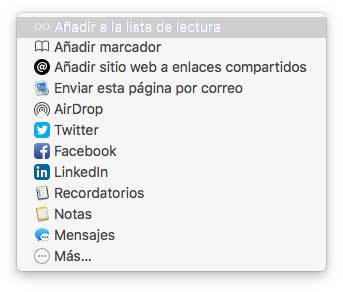 Si estamos en un Mac y queremos acceder a la lista de lectura de Safari, tenemos que seleccionar la URL desde el navegador Safari y dirigirnos a la esquina superior derecha para desplegar el icono compartir (un cuadrado con una flecha). Una vez desplegado, seleccionamos “Añadir a la lista de lectura”.