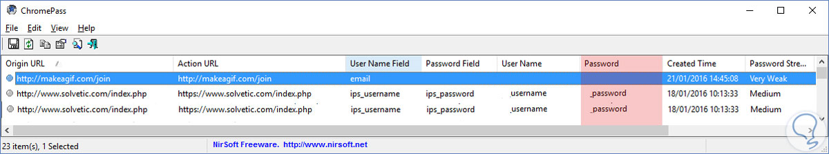 Una vez se abra el ejecutable, te aparecerá una ventana con el listado de páginas webs donde tienes almacenadas tus contraseñas, además de mostrarte éstas. A veces no somos conscientes de los datos que tenemos almacenados en un simple navegador. Haz clic en Actualizar para que los datos que te aparecen estén actualizados. Los datos que te aparecen son: