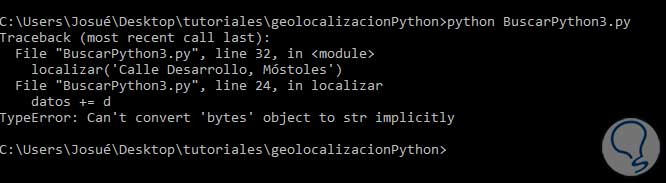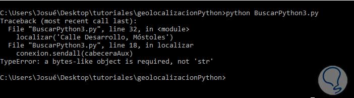 La tercera línea de código se utiliza para rellenar el hueco {} de la cabecera con la dirección que se pasa a la función (fíjate en quote_plus, se usa aquí).cabeceraAux = cabecera.format(quote_plus(direccion))En la siguiente línea se envía la petición, observa que usamos la función encode, lo que hacemos es enviar los datos codificados en utf-8, si no lo hiciéramos obtendrías un error como observarás en la siguiente imagen: