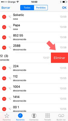 Nos aparecerán las llamadas con un botón rojo a la izquierda. Para borrar una llamada específica de tu historial, basta con hacer clic en el botón rojo y nos aparecerá la palabra “Eliminar” en la parte derecha de la llamada. Lo pulsamos y la llamada desaparece.