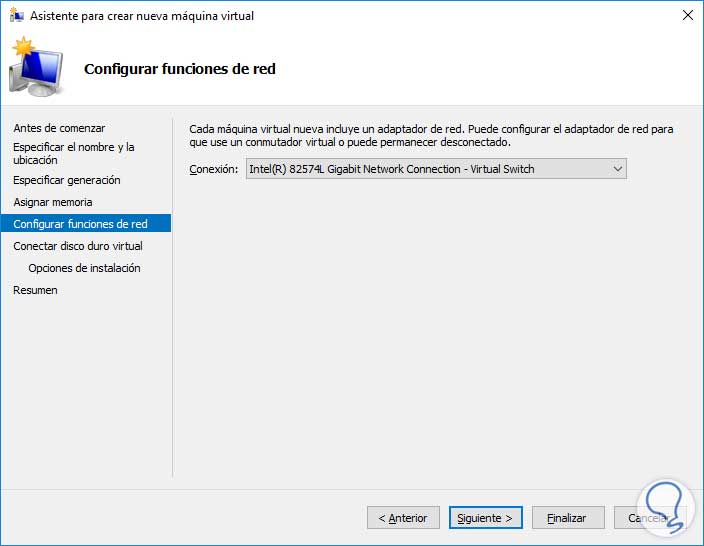El siguiente paso es configurar los parámetros de la red, contamos con opciones como No conectado o seleccionar el adaptador virtual asociado al adaptador físico del servidor. Elegimos la opción que más se ajuste a nuestra necesidad.