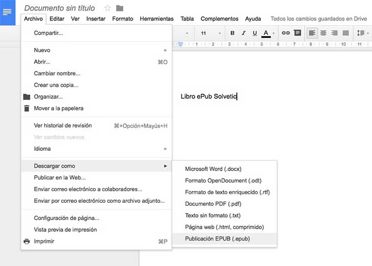 Lo primero que tenemos que hacer es cargar el documento que queramos descargar en formato ePub en nuestra cuenta de Google Docs. Una vez que lo tenemos aquí, tenemos que seleccionar en la parte superior “Archivo” –“Descargar como” – “Publicacion EPUB”.