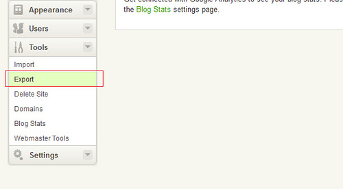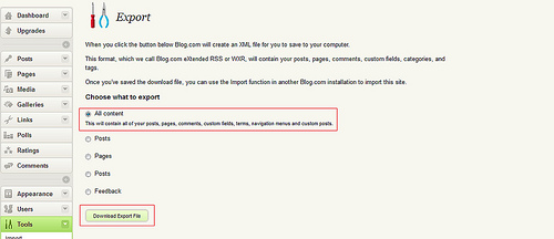 Para ello entramos en nuestra cuenta de Blog.com donde tenemos el Blog a importar, pulsamos en Tools / Exportar