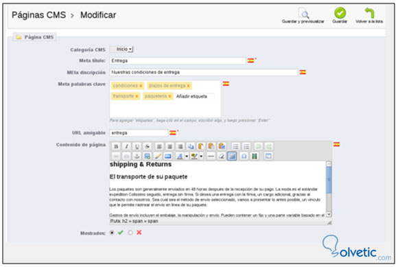 Para realizar algún tipo de modificación con respecto a este tema es necesario ingresar en preferencias > CMS > modificar. Una vez dentro se podrá el texto en la opción de “Contenido de página”: