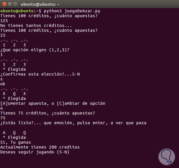seguir = input()En el código la variable ace, es la opción que va a ganar, se pintará al final como letra A, si es una opción que no gana se pintará como Q, puedes ver la opción que has elegido con el símbolo ^ que aparece debajo de la opción.