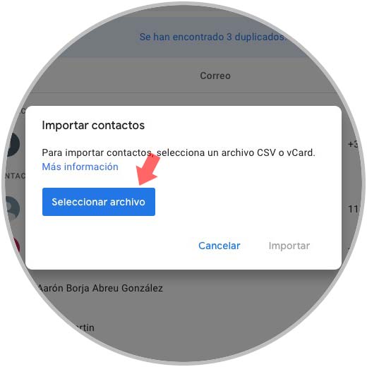 Finalmente seleccionamos el archivo descargado con todos nuestros contactos del iPhone. De este modo habrá quedado importado todo el contenido en la cuenta de Gmail.