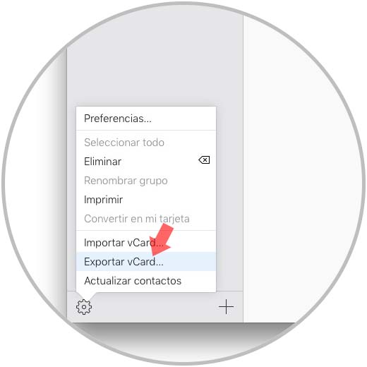 Veremos que se despliega un menú en el que debemos seleccionar el apartado de “Exportar vCard”. Veremos que se descarga un archivo.