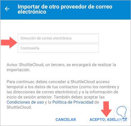En este punto, tenemos que introducir los datos de nuestra cuenta de correo de iCloud y la contraseña correspondiente. Seleccionamos “Adelante; Acepto” y el proceso comenzará.