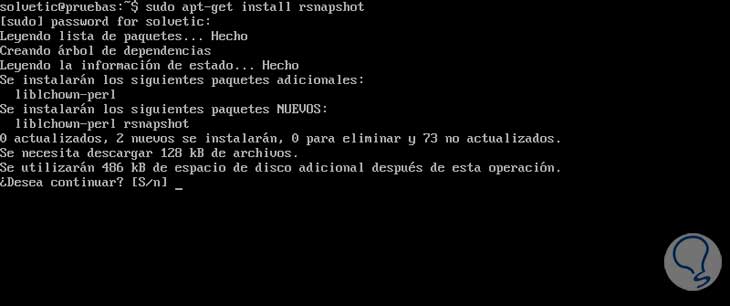 Esperaremos que los paquetes sean descargados e instalados. Si deseamos crear copias de seguridad para servidores remotos debemos configurar SSH sin contraseña, para esto debemos crear un SSH público y una llave privada para el respectivo acceso. Vamos a generar estas llaves usando el siguiente comando: